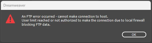 I'm having an issue with Dreamweaver where when I try to connect my site to an FTP server I get the following error: "An FTP error occurred - cannot make connection to host. User limit reached or not authorized to make the connection due to local firewall blocking FTP data."