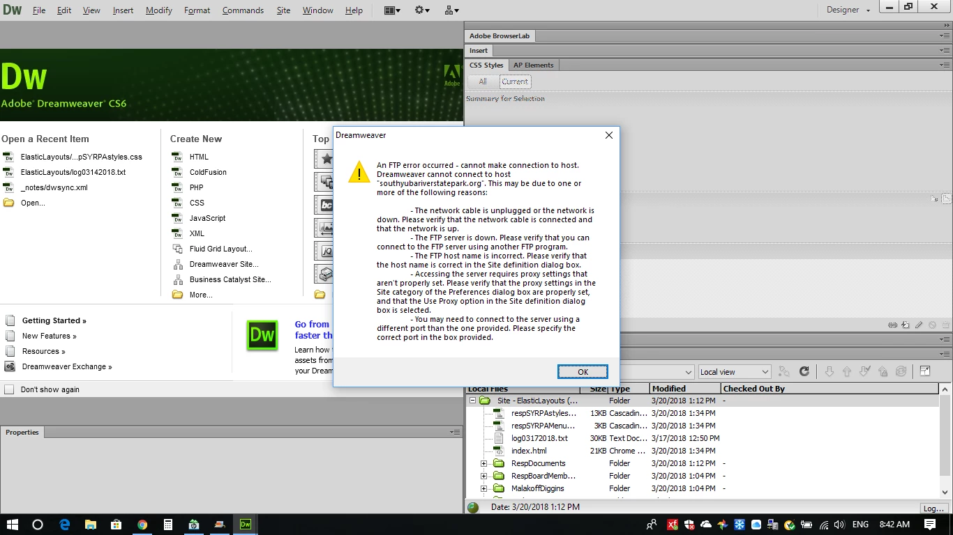 Below is the screen shot of the error I get when I try to connect to the FTP server. When I first installed dreamweaver I was able to connect and transfer all the files I needed to my computer. After that I have never successfully connected again. There is also a webpage on this server that I can no longer access. However, I can access it outside of my network at a neighbors house. I have worked for about 2 weeks with support from the router company and we made a fair amount of changes and still nothing. I am doing volunteer work and trying to maintain a website. Any suggestions are welcomed I am frustrated.