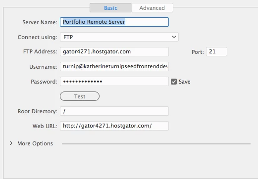 I am new to dreamweaver and using it for class. I made a portfolio and need to connect it using an ftp. I am using HostGator and have it all connected in dreamweaver. However, when I go to the host website I get an Error 404 message, so it is not connecting from dreamweaver to the public host. I feel like there is something simple I am missing. What I have in the local file is just the file that contains my project. In the root directory I just have a slash because every thing else I put gives me an error. Any help would be much appreciated
