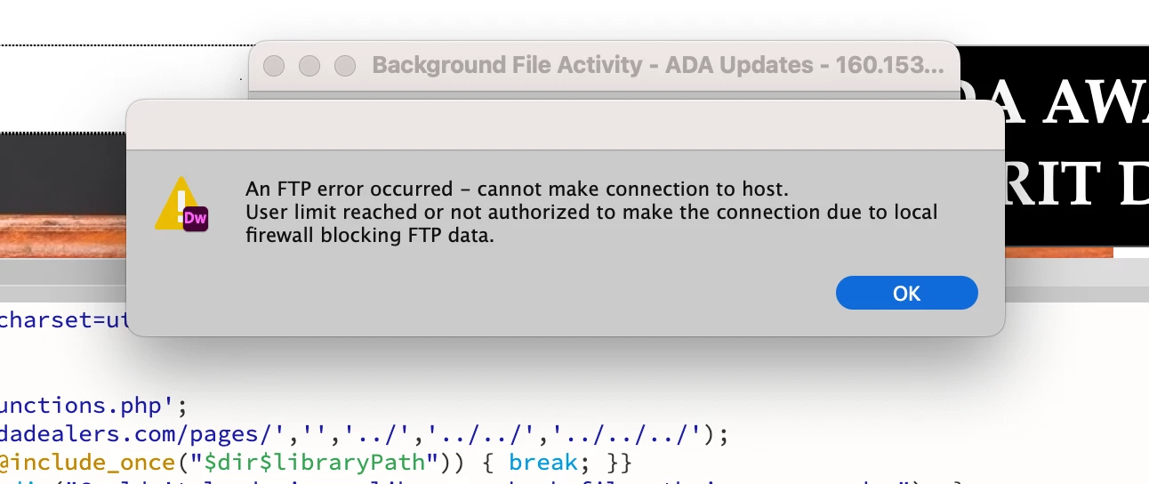 I have been trying to update a client's website and keep getting the error below. I've been using DW for about 3 years now. It's up to date. However, I did just update my Mac OS to the latest in Ventura. Before wasn't having any issues, so I checked my local firewall, and it's inactive. Thought maybe it was the firewall in the router at my Airbnb, but tried a completely different network and haven't had any issues. I do use a VPN (Surfshark), but have it disconnected. I've also had the same VPN for 2 years and have never had an issue. Any ideas?