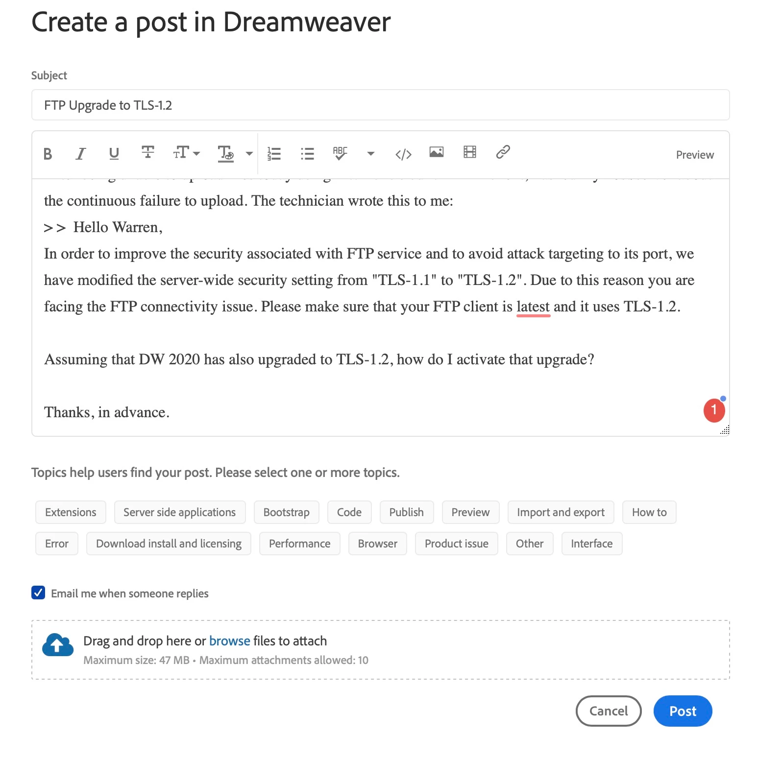 After being unable to upload files today using DW 2020's built-in FTP client, I asked my host/server about the continuous failure to upload. The technician wrote this to me: