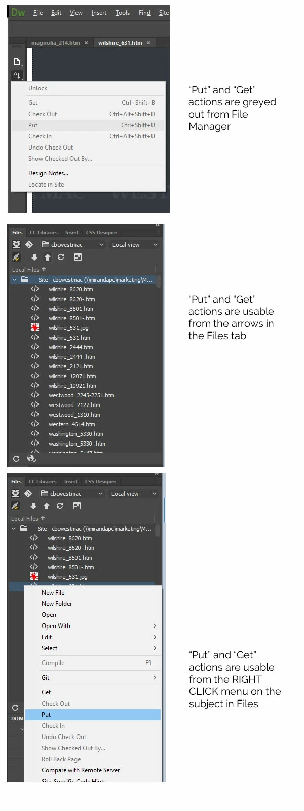 Put and Get actions are unusable from the left toolbar, File Manager tool. Put and Get are usable from the Files tab. I am trying to put a file on my server. Please see reference image below. My FTP settings are connected since I have no problem uploading from the Files tab. I synchronized the server, no change. I disconnected and reconnected, no change. I can use "Put" and "Get" from the File Manager if I select Desktop instead of my server in the left hand drop down on the Files tab. I have the latest version of Adobe Dreamweaver 2020. It is January 6, 2020.