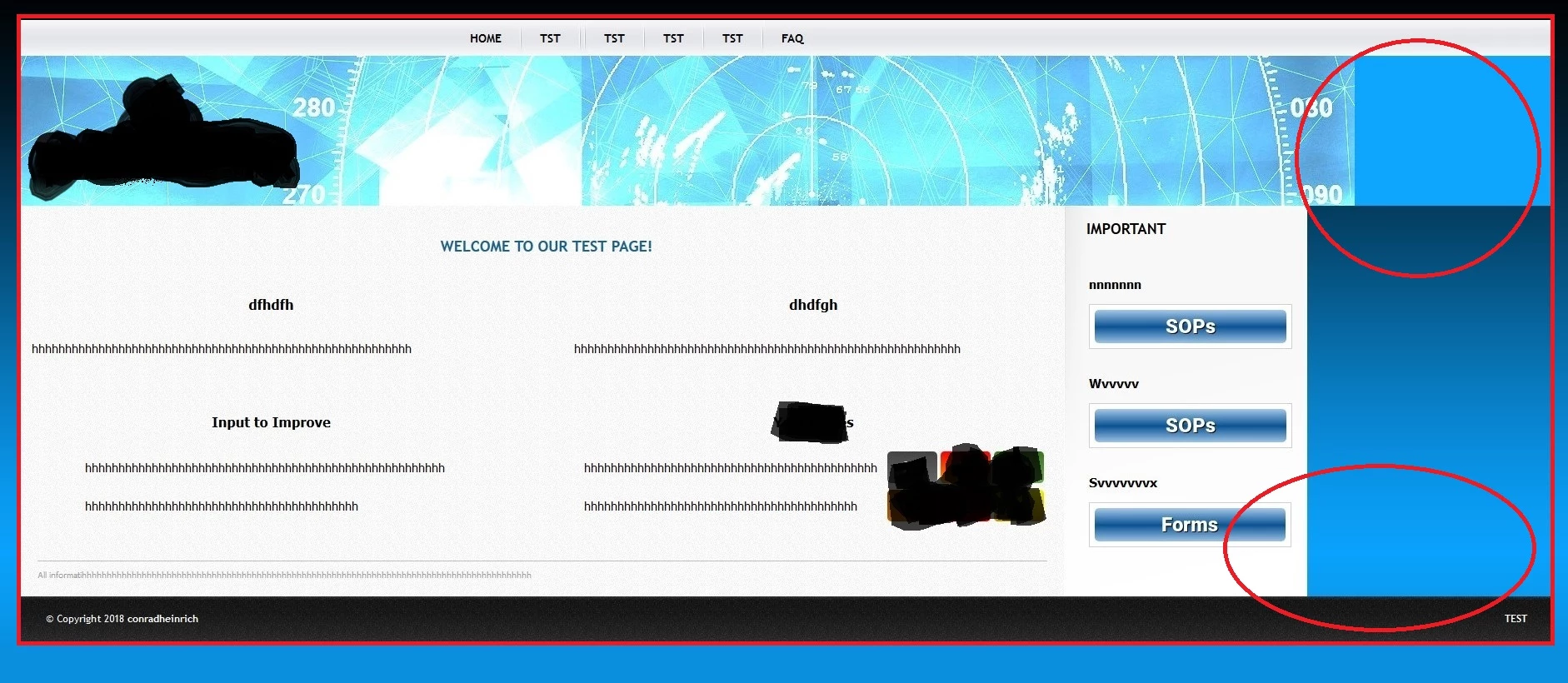 Wie man hoffentlich erkennt, wachsen die Kopf- und Fußzeile und der darunterliegende Grafikteil mit (rote Kreise), während der Rest, als der mittige grauhinterlegte Inhaltsbereich es nicht macht. / Hope tt you see the different sized elements. Footer, headline and graphic below grow with zooming in, spoiling the view in total.
