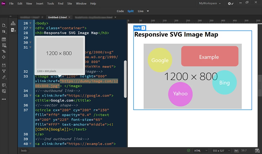 IMPORTANT:  Toggle to Live View (Ctrl+Shift+F11).  SVG images won't display in Design view.