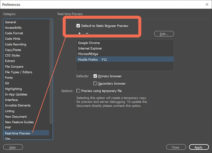 When in v18 even with the box unchecked to view as temp file, dreamweaver still shows as temp file. I deleted the winfilecache file to no avail. When I click the browser button I want dreamweaver to open the file ON the website.