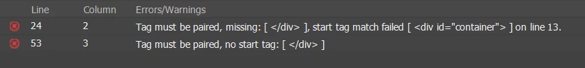 The issue is with the container div. For some reason I'm receiving these errors, even though the tags are very clearly paired: