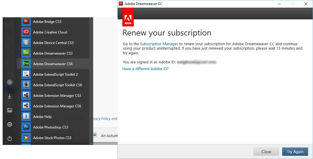 I had Dreamweaver CS6 before I subscribed to Creative Cloud, but now that I've canceled my CC subscription I can't open CS6. It keeps trying to verify my CC subscription.