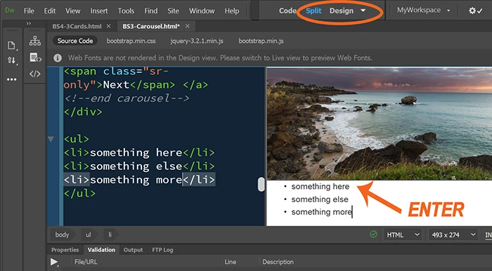Hi. Recently came back to DW for coding and I'm so very pleasantly surprised. New functionality, Emmet functionality, super! But have one issue in Emmet... while "tab" expands HTML abbreviations correctly for me, what I'm used to from other code editors is then being able to tab in between tag wrappers so I can easily jump from <li> to <li> for example. But in my case tab is expanding my first content into a tag for that content, instead of going say from <li> to <li>. Is there a setting for this behavior or a temporary disable of tab expansion? Example: