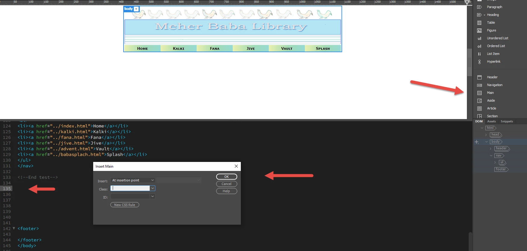 Begin to develop a page. From the right panel Insert selected Insert MAIN