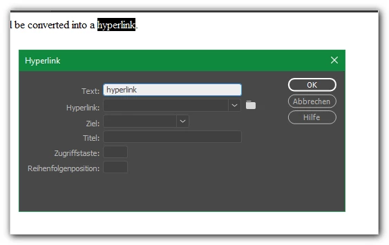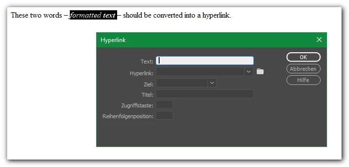 I want to create a hyperlink of a selected text which has several styles – e.g. here italic and bold-italic. But DW (CC) does not overtake the selected text to the dialog box: