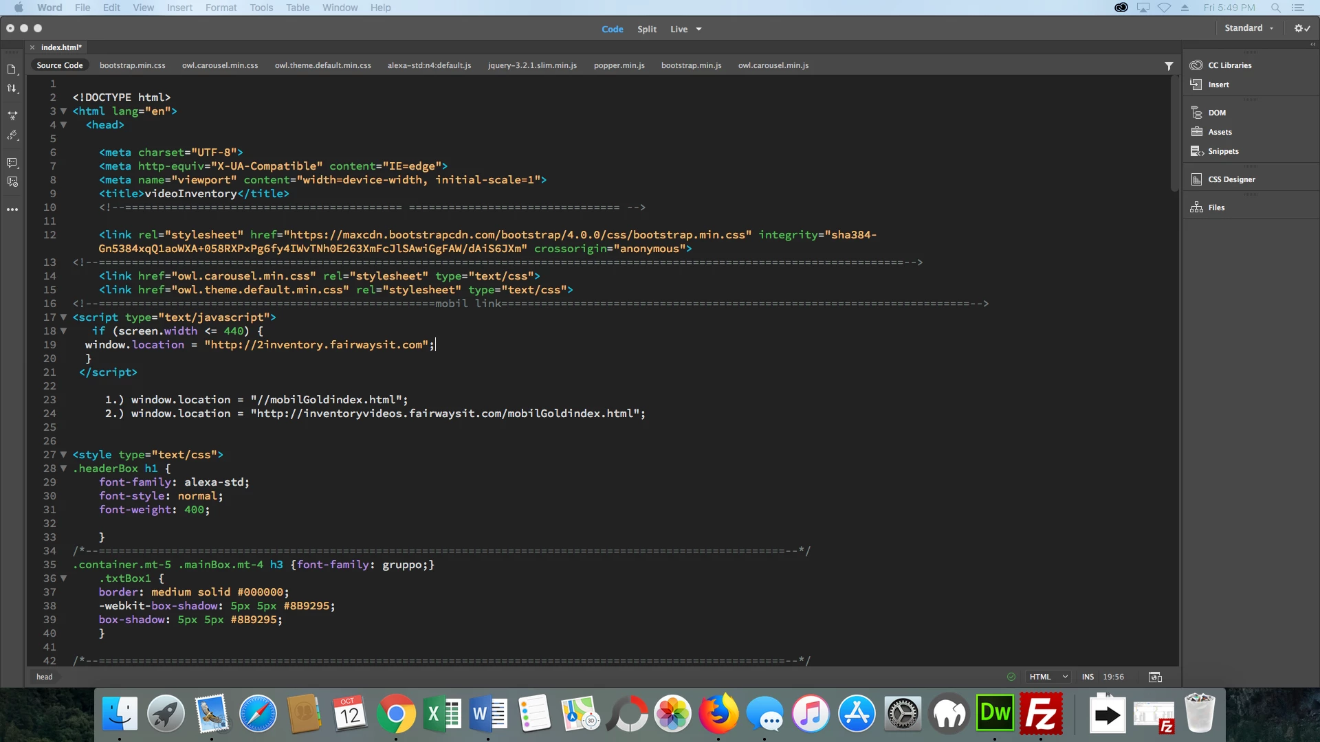 Is the ‘window.location’ script wrong for switching to Mobil pages within the same site ? I typed two versions of the code(address) I used in the window.locaton script to go to the Mobil page on small screens. I pasted it below the script tag for your review (attached pic). Is there something wrong with either version of the code?
