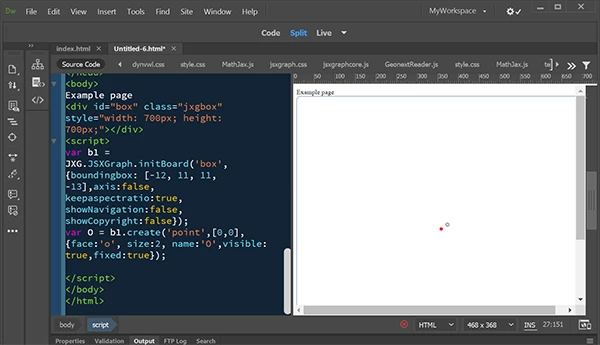I encounter a problem using Dreamweaver CS 5.5, version 11.5 Build 5366. I know it’s not the latest one, but that’s what I have my license for. I used to program with the jsxgraph package and look at the result using “Live-Ansicht”(Live View, I suppose). In 2018 I had a break for roughly a year. Now I wanted to continue, but only see an empty box on the right, without the axes ect. I don’t know why? Can you please help me and tell what options or so I have to choose?