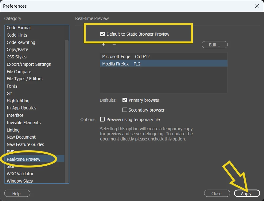 However, when I try to test a page in Dreamweaver with "Preview in browser" feature, the browser gets the local file (file:///D:/mySite/folder/subfolder/TMP1g3szin.htm), instead of the web address (http://mySite:8080/folder/subfolder/TMP1g3szin.htm )