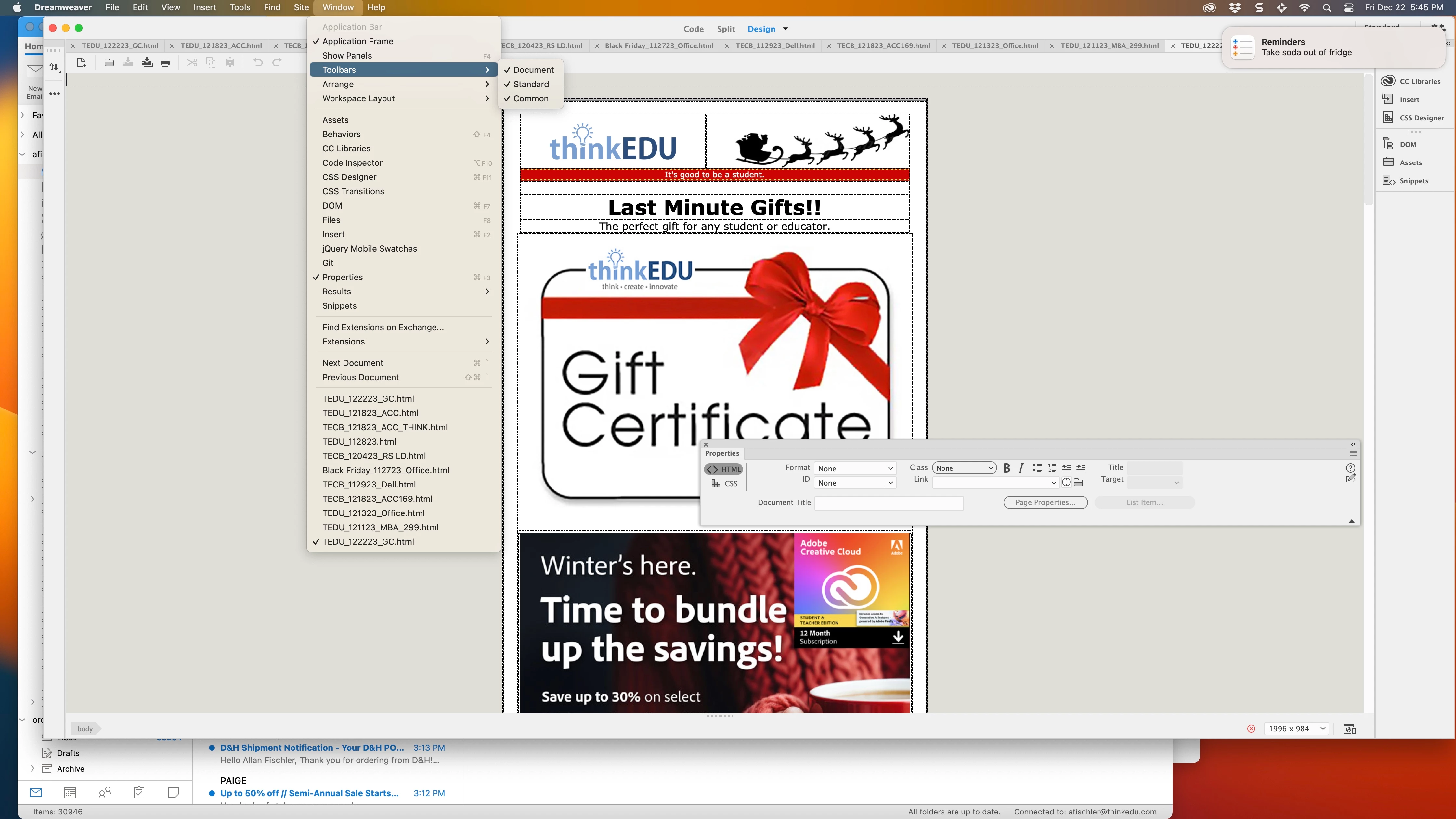 Latest version. New Mac. Opened file I was working with yesterday and got a "update cache" message - clicked ok. Since then, no left side toolbar and I tried a nunch of things. Whatever that cache did, reset a bunch of things and messed my my DW set-up. How do I get my toolbar back? Thanks!