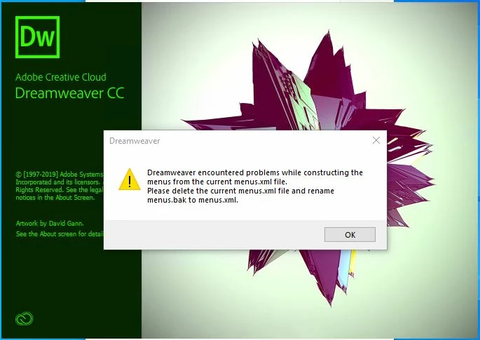 Menus.xml error preventing dreamweaver from starting: Dreamweaver CC 2018