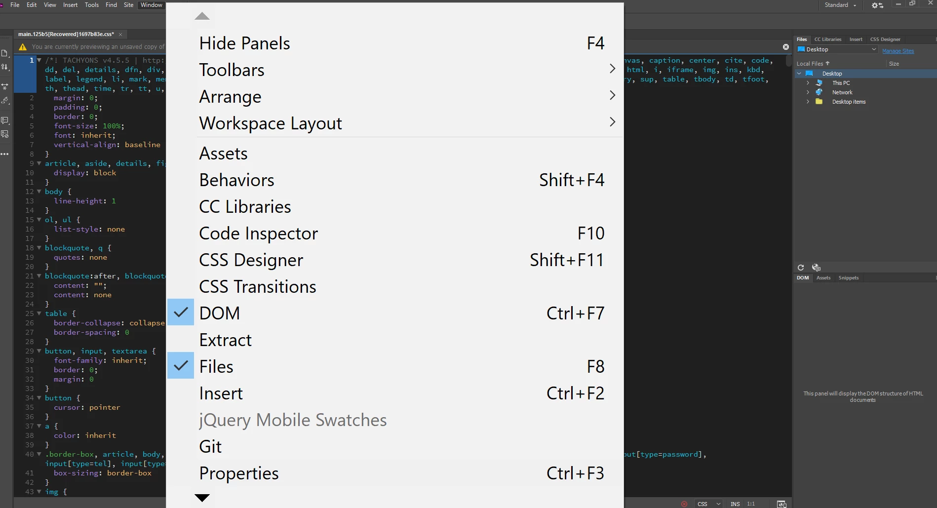 Moving dreamweaver to large monitor disrupts dropdown menu items