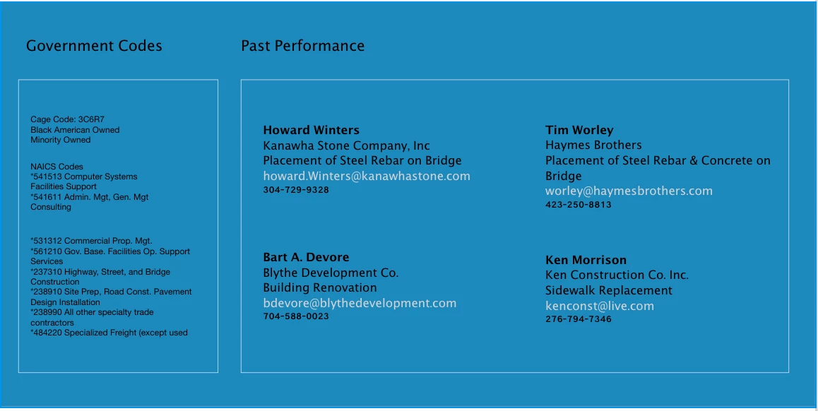 In the code I have a section with a class called “refferences”. In this section it holds government codes that contractors use, and past performances for the company I am building the site for. I am wanting both ‘Government Codes’, and ‘Past Performance’ to be side by side like they are in the initial design of the website.