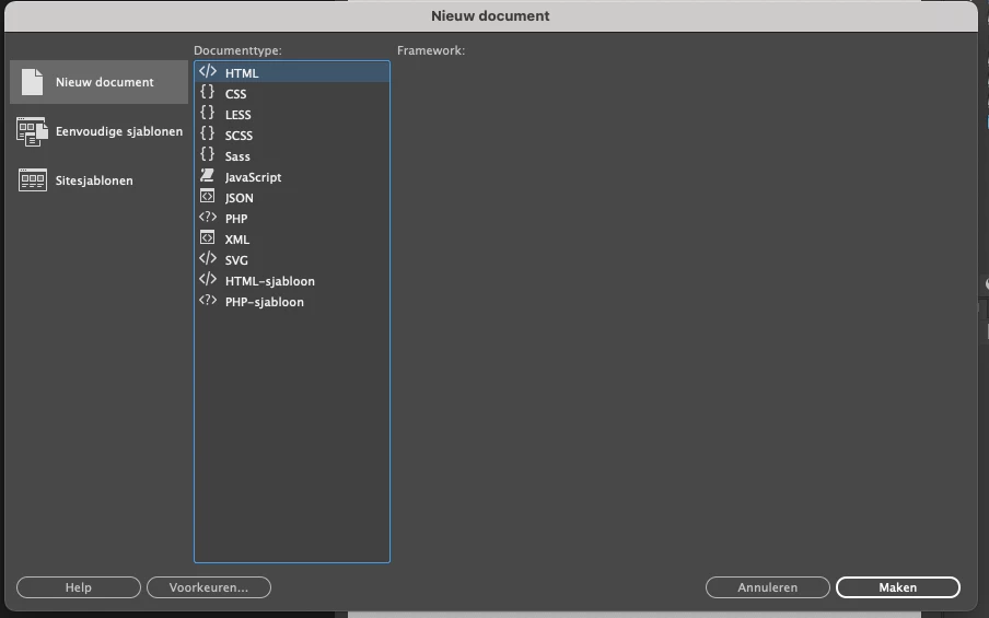 When I already have one document opened in Dreamweaver and I want to open a new HTML document without template I do not get the option to select a framework (non / bootstrap). Does anyone knows a solutions?