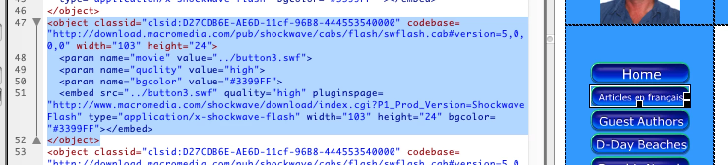 <embed src="../button3.swf" quality="high" pluginspage="http://www.macromedia.com/shockwave/download/index.cgi?P1_Prod_Version=ShockwaveFlash" type="application/x-shockwave-flash" width="103" height="24" bgcolor="#3399FF"></embed>