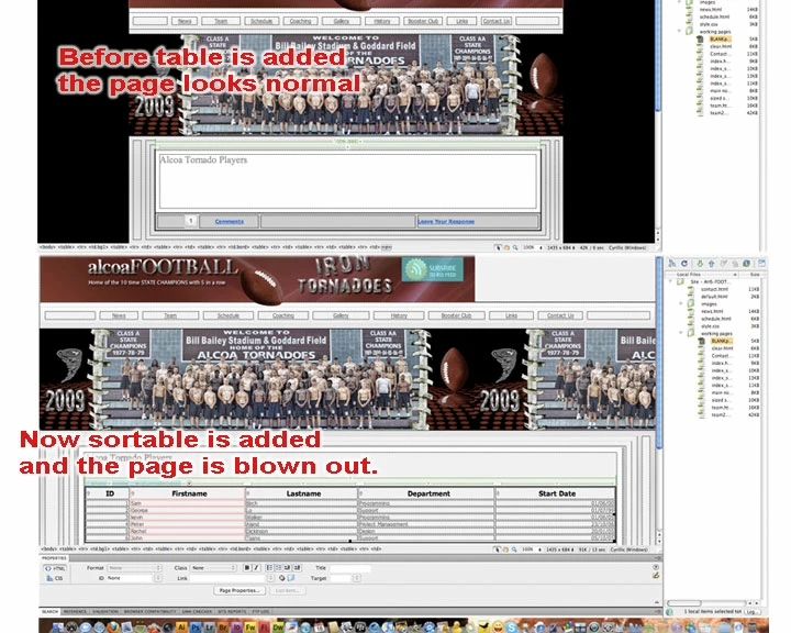 I have a web template that I'm using and when I go to insert the phatfusion sortable my page expands really wide and my header and overall page is all wrong. I have scoured the internet for a fix on this and how to stop the page from blowing out of bounds. I hope it's something simple and I'm sure it is but I'm really new at this so can anyone enlighten me on how to fix this? I'm wanting the sortable to list the football players where parents or whomever can find their player and this sortable is the best I have seen.