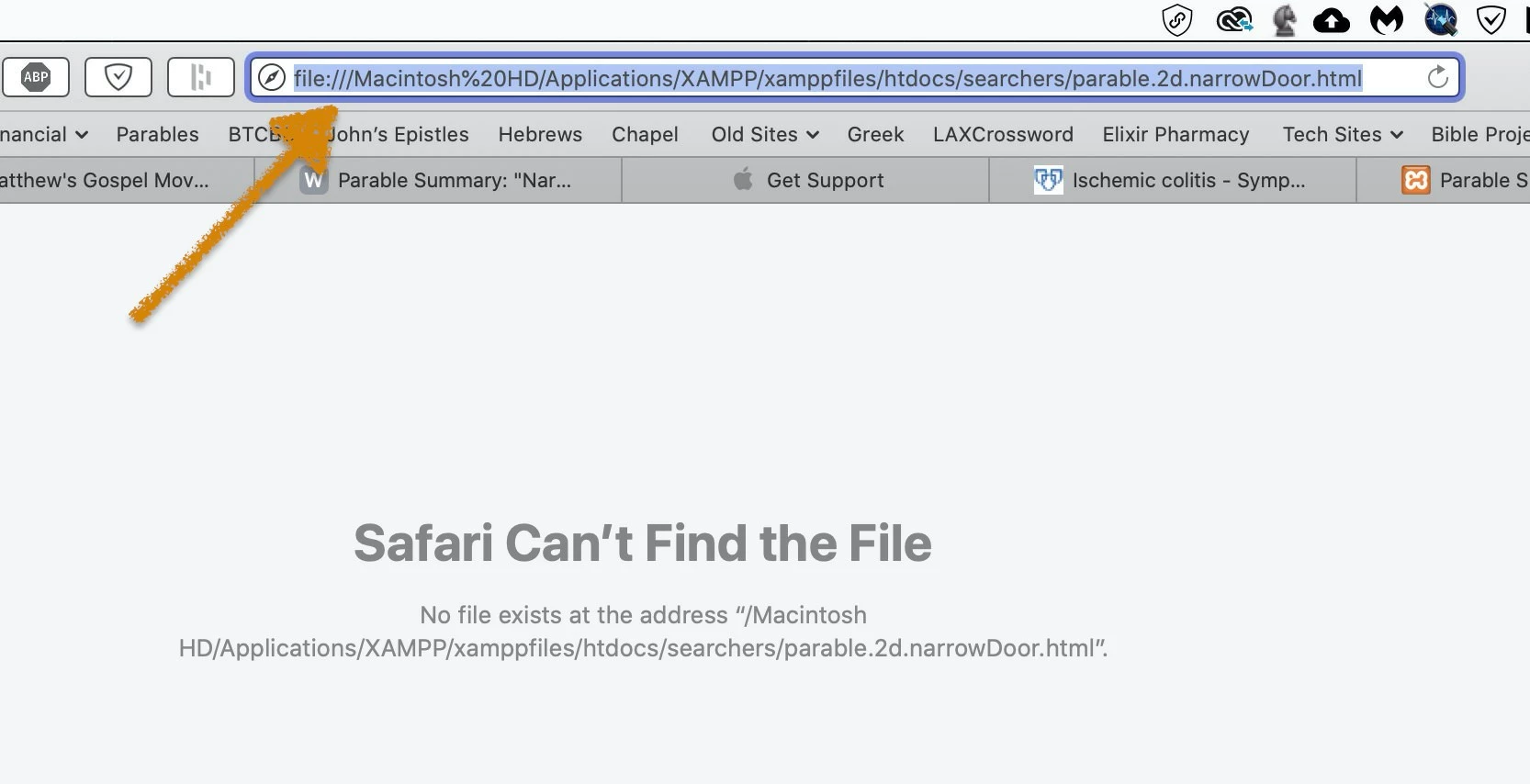 I suspect that the referenced pathway error indicates that I loaded the site's files in an inappropriate Applications folder location. I say that because, instead of seeing the hyperlink start with the usual "localhost/..." this new site's hyperlinks start with "file:///" (see arrow above). This problematic site's files are in a different directory (titled "searchers") than the root directory "WCD" whose files all open locally without a snag.