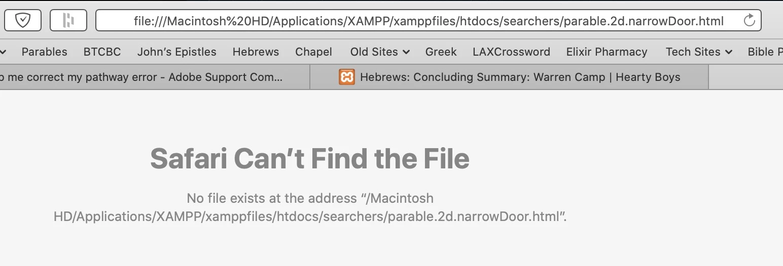 On a new site and a new directory, to which I applied XAMPP, I seem to have an incorrect pathway to this new site's pages. When I right-click a file in this new site (using Mac Catalina), the "Open in Browser" option opens and I select Safari. However, the page does not open. Instead, Safari shows this error message. . .