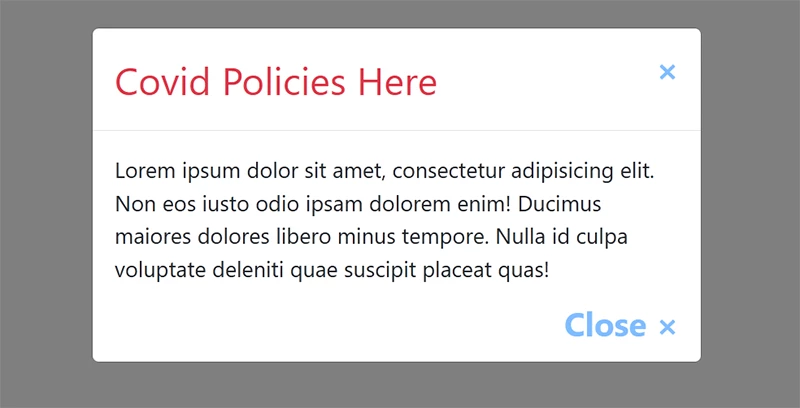 I want to add a delayed popup notification to my homepage that will display our policies regarding covid.