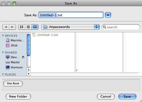 In the Dreamweaver Files panel, select the .htpasswds folder, right-click, and select New File. Dreamweaver creates a new file, and highlights the name ready for editing. Press Return to confirm the new name. Then double-click to open the new file in Dreamweaver ready for editing.