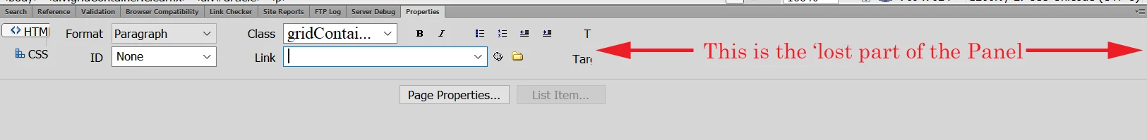 I cannot see any way to recover the right-hand half of the missing panel, which makes controlling the coding process very difficult. I have tried moving, closing/opening the panel. The problem remains whichever Workspace I use. So there is something wrong with the way that Panels are managed? Can anyone help. I am using DW6.