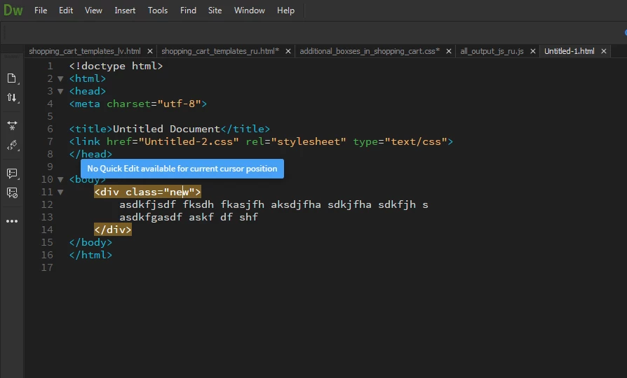 I am using the latest DW CC 2017 on Window 8.1 64bit. My site is defined, I have a linked stylesheet in the proper location. Whenever I attempt to use Quick Edit I get the message "No Quick Edit available for current cursor position".