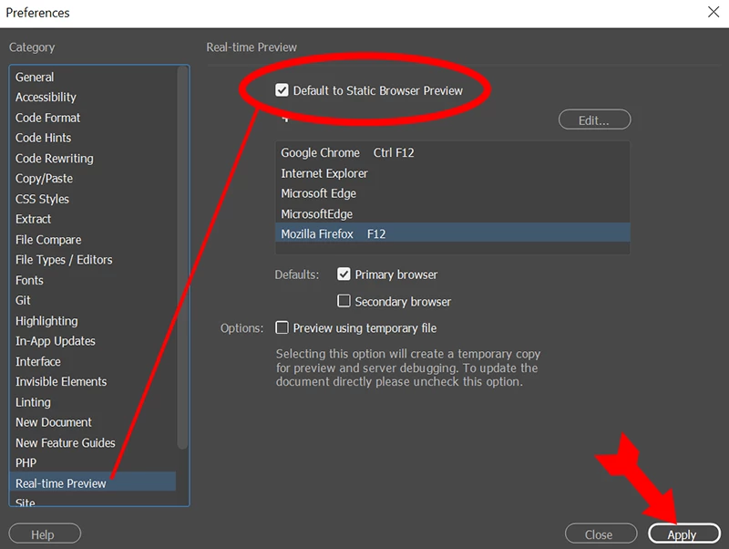 Dreamweaver 21.2 is not displaying my pages correctly when I try to view them via Real-time Preview. The pages look fine, fully rendered while within the Dreamweaver application, but when I try to view them in any browser associated with Real-time Preview, the raw page displays but the CSS does not. Yes, I've checked my code for errors. Yes, I've specified a site under Manage Sites. Yes, I've tried multiple Dreamweaver projects using multiple browsers. But still, any time I try to use Real-time Preview, the styling does not show up. This just started happening about a week or two ago. Any suggestions?