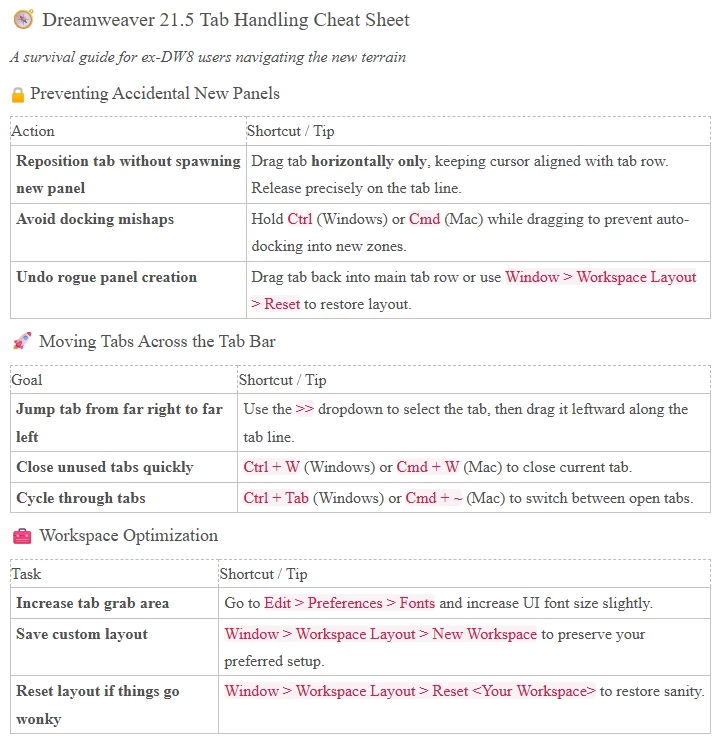 In Dreamweaver 21.5, when I drag tabs left/right, I must be releasing them too high or something, because they often end up opening a new coding window/pane, which is really annoying. I then have to carefiully drag the new window's tab back down to the original window's tab list. This takes time. Time which I could have spend coding.
