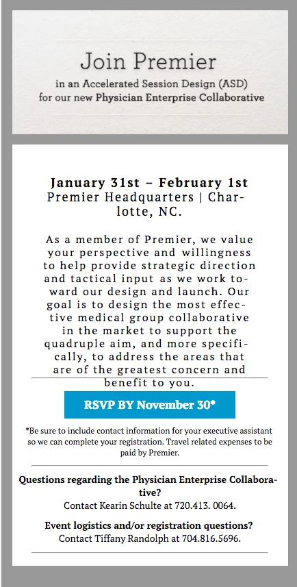 Premier Headquarters | Charlotte, NC.<br><br/><span style="font-size: 16px;">As a member of Premier, we value your perspective and willingness to help provide strategic direction and tactical input as we work toward our design and launch. Our goal is to design the most effective medical group collaborative in the market to support the quadruple aim, and more specifically, to address the areas that are of the greatest concern and benefit to you.</span>