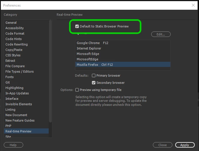 Does anyone know how I can return Dreamweaver's original real-time preview and stop having to use the local server? Also, if you could spare me the time and effort, if I want to return to my local host/server, how do I flip back to that local host/server, after I hopefully am able to preview my work in Edge or Chrome.
