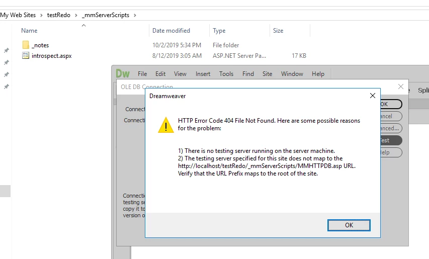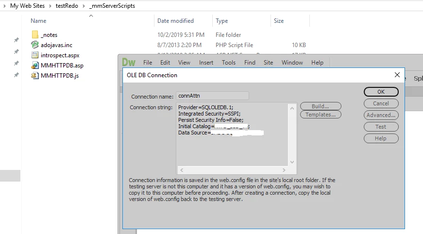 while back when Adobe started not supporting asp.net and I was running into Http Error 404. I finally figured it out that it was due to the MMHTTPDB.asp file in the folder _mmServerScripts, so out of frustrations and a joke I copy the folder with the said file on the new project I was on and surprising now my app allowed me to connect the MsSql server. That was great and several years back from XP to W7. Now I am running into the same problem but the above method did not work. I soon found that after copying over the said files, I tested the connection in dreamweaver and strangely, it deleted three files namely, MMTHTTPDB.asp, MMHTTPDB.js and adojavas.inc. Anyone ever run into this problem.
