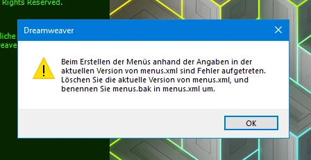 Ok, after that I started DW, the above message came, started it again and it finally came up. Plus all the menu items are now available. Yeah!