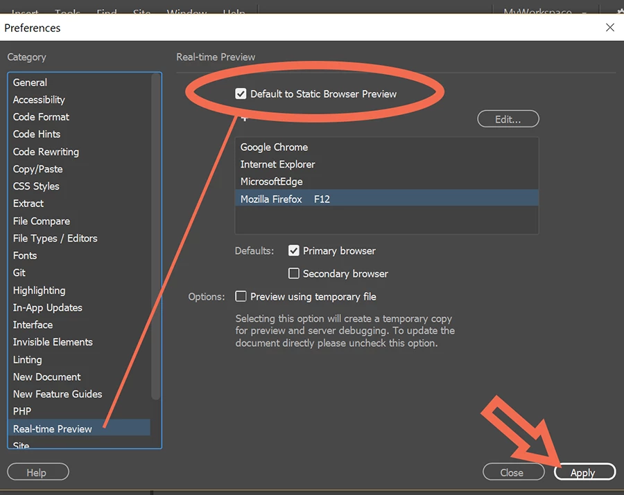 Whenever I select Preview in Browser, by pressing F12, using Dreamweaver’s server, it works sometimes and other times it does not. It seems to depend on the port number that is selected. I have tried to use a consistent port number by altering the json file in the configuration folder, per the instructions provided by Adobe, but this does not work. Does anyone know how to make Dreamweaver server work consistently, so that I do not get the following error: “You tried to access an external HTML page, which can not be opened on the device for preview. Open the page in Dreamweaver to preview the page on the device.You tried to access an external HTML page, which can not be opened on the device for preview. Open the page in Dreamweaver to preview the page on the device.