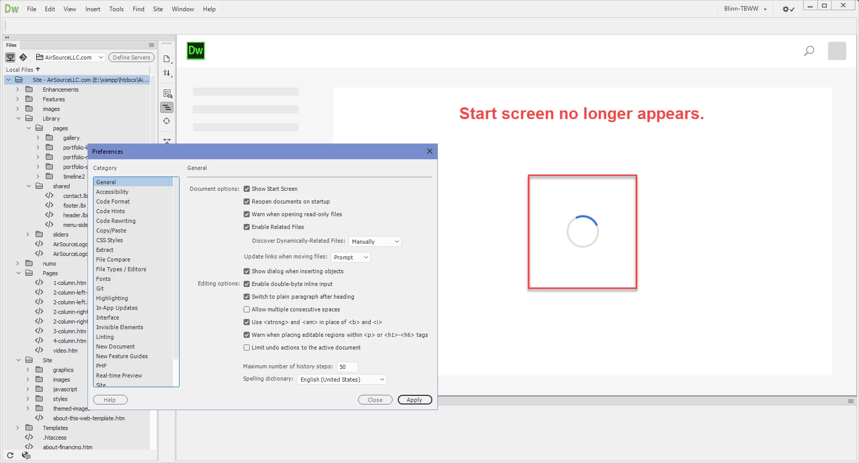 Starting today, the Start Screen no longer appears when I open Dreamweaver. The progress wheel spins and spins. I can turn off the Start Screen, but I find it useful and would like it to appear. Recommendations?