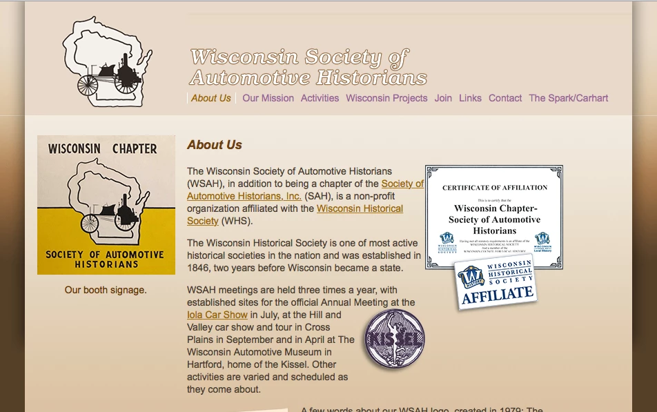 <p class="bodylinks"><img src="images/Cert-of-affiliation-sticker.png" alt="Certificate of Affiliation" width="200" height="220" align="right" />The Wisconsin Society of Automotive Historians (WSAH), in addition to being a chapter of the <a href="http://autohistory.org" target="_blank">Society of Automotive Historians, Inc.</a> (SAH), is a non-profit organization affiliated with the <a href="http://wisconsinhistory.org" target="_blank">Wisconsin Historical Society</a> (WHS). </p>