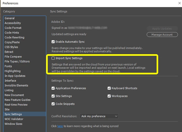 Dreamweaver 19.0 does not import previous settings from 18.2 which have been saved to the cloud. I agreed on opening to update from the cloud which it didn't do. Then I went to sync settings > manage and checked "Import sync settings" and restarted Dreamweaver. Under Sync settings it said updated settings are available, so I updated, and still nothing happened.