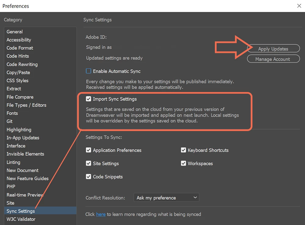 Synchronizing Dreamweaver settings between two PCs does not work at all