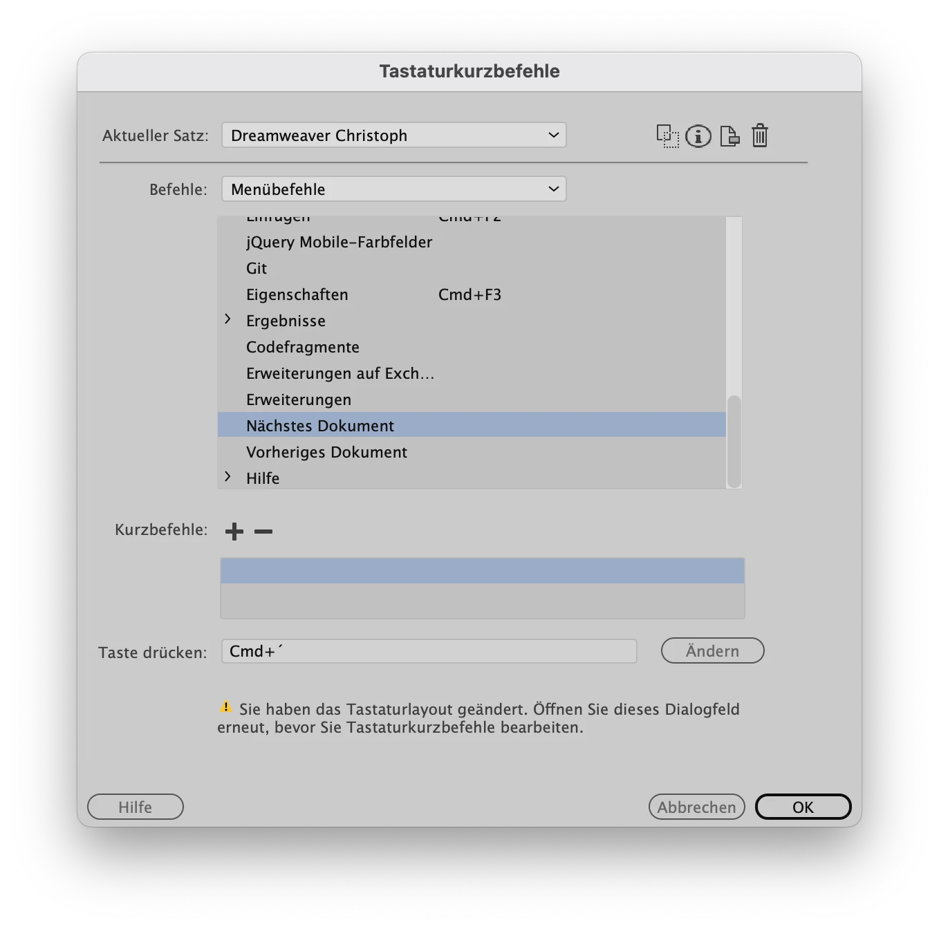 Unter Aktueller Satz = "Dreamweaver Standard" meldet DW: "Der aktuelle werkseitige Satz kann nicht modifiziert werden. ..."