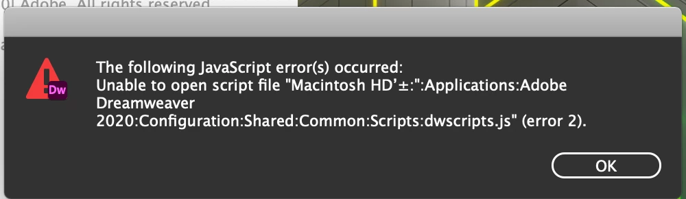 Went to use Dreamweaver 20.2 today using Mac OS 10.15.7 and got this message. Any thoughts?