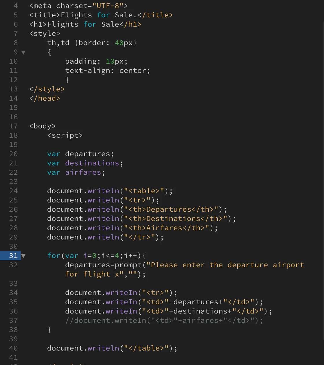 1. How do get input from the prompts to show up within the table that I have designed? Is there a reason why my 'For' statement is not currently working?