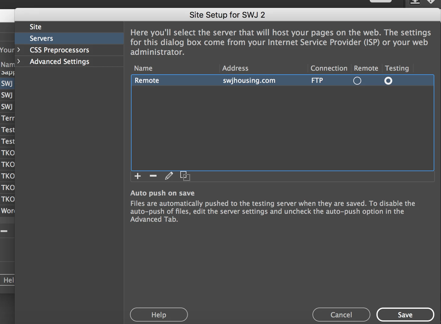 I am trying to turn off the auto push when clicking the save button in the edit server dialog box. I have unchecked the auto push option in the advanced tab, yet when I click Save it shows that my files will be automatically uploaded and to disable it this, uncheck the auto push option.