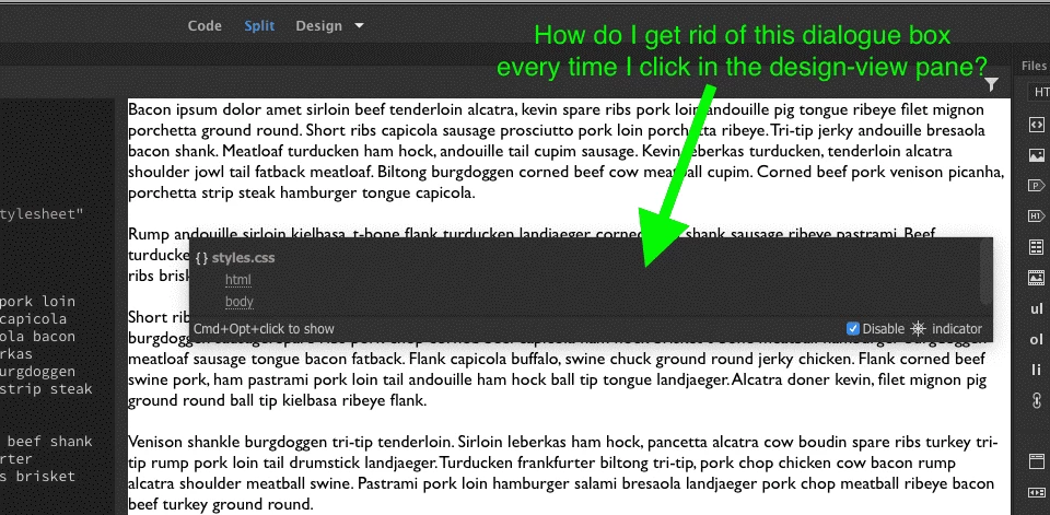 Turn off CSS pop-up box that appears every time I click in the Design View pane