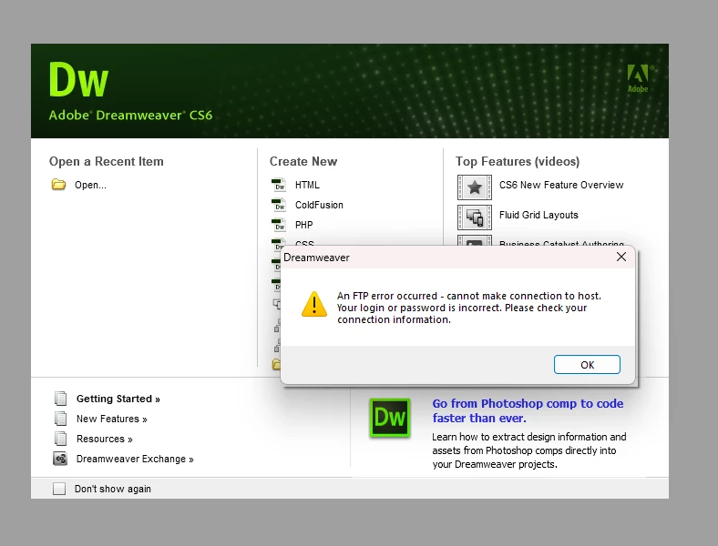 I recently installed a licensed copy of Dreamweaver CS6, but am unable to connect to my server. I receive the error listed in the attached image despite all of our credentials being correct (I use the same credentials to connect via FileZilla without difficulty) and the app not being blocked by our firewall. Any idea why this would be happening?