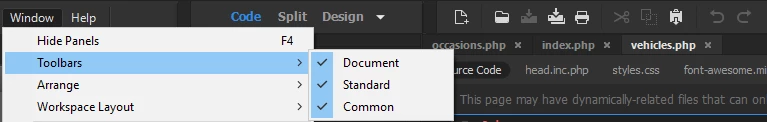 After updating my Dreamweaver I haven't got my toolbar at the top with things like save, save as, h1, h2 etc. I can't find a way of getting it back. The only option when I go to toolbars is standard. There are items on a toolbar on the left, but editing it there doesn't seem to be the ones I want.