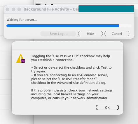 Whenever i want to connect to FTP in dreamweaver on my Dektop Mac Studio M4 Max it doesn't work. Just hangs and keeps trying.