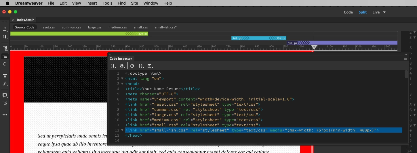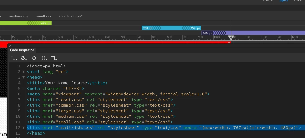 Working with Dreamweaver 2020 (v20.0) today, I noticed that Media Queries set from the < link > element with the "media" attribute (line 12 in the image below), do not appear in the Visual Media Queries Bar... only media queries that are built into the CSS file.